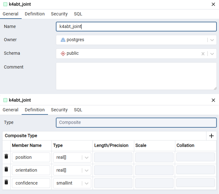 对于 position 和 orientation 字段我们直接使用 real[] 数组来存储,pgsql 的 real 类型就是 c++ 中的 float 类型,4字节的单精度浮点数。对应的 sql 代码如下: