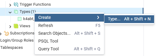 首先我们要创建 k4abt_joint_t 结构体的类型。打开pgAdmin 4,我们在 数据库→Schemes→public→Types 路径下右键 Types,选择 Create →Type... 。