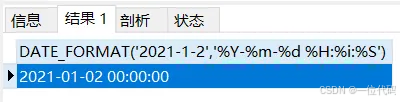 **命令:**select DATE_FORMAT('2021-1-2','%Y-%m-%d %H:%i:%S')