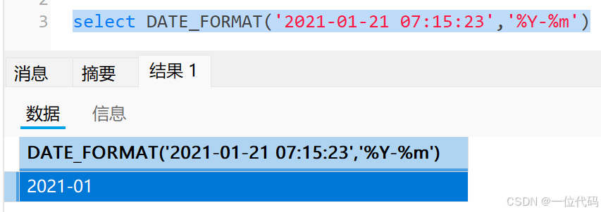 **命令:**select DATE_FORMAT('2021-01-21 07:15:23','%Y-%m')