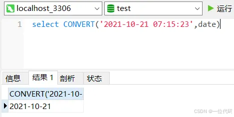 实例:select CONVERT('2021-10-21 07:15:23',date)