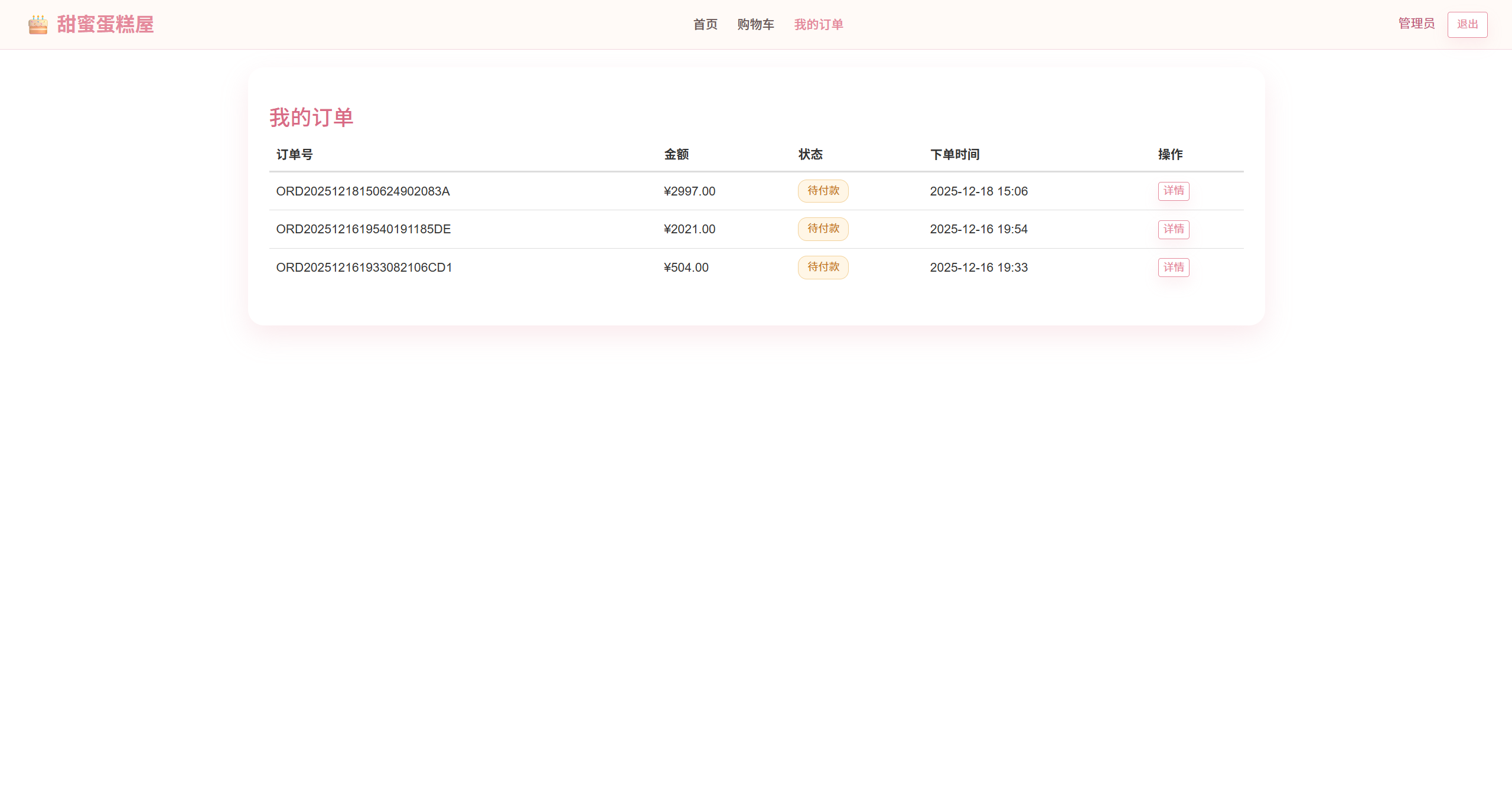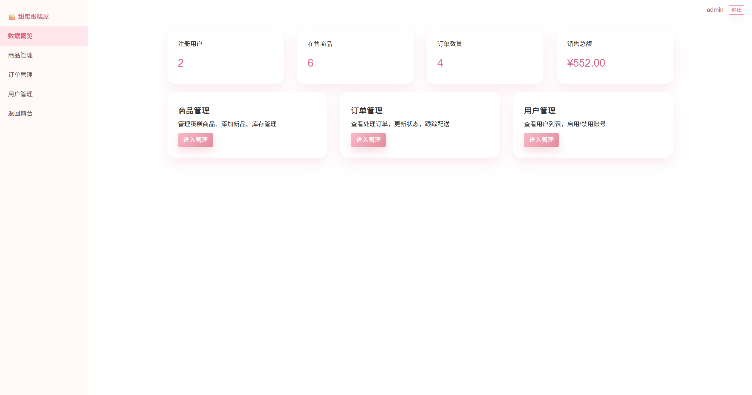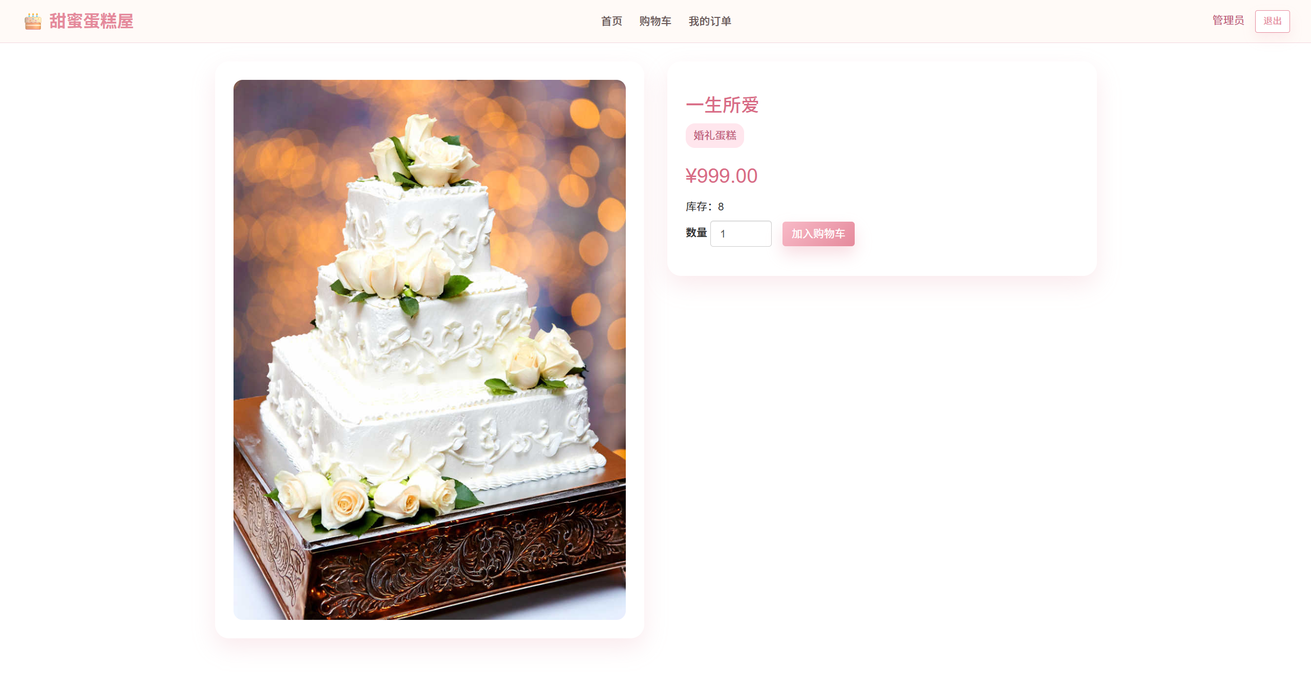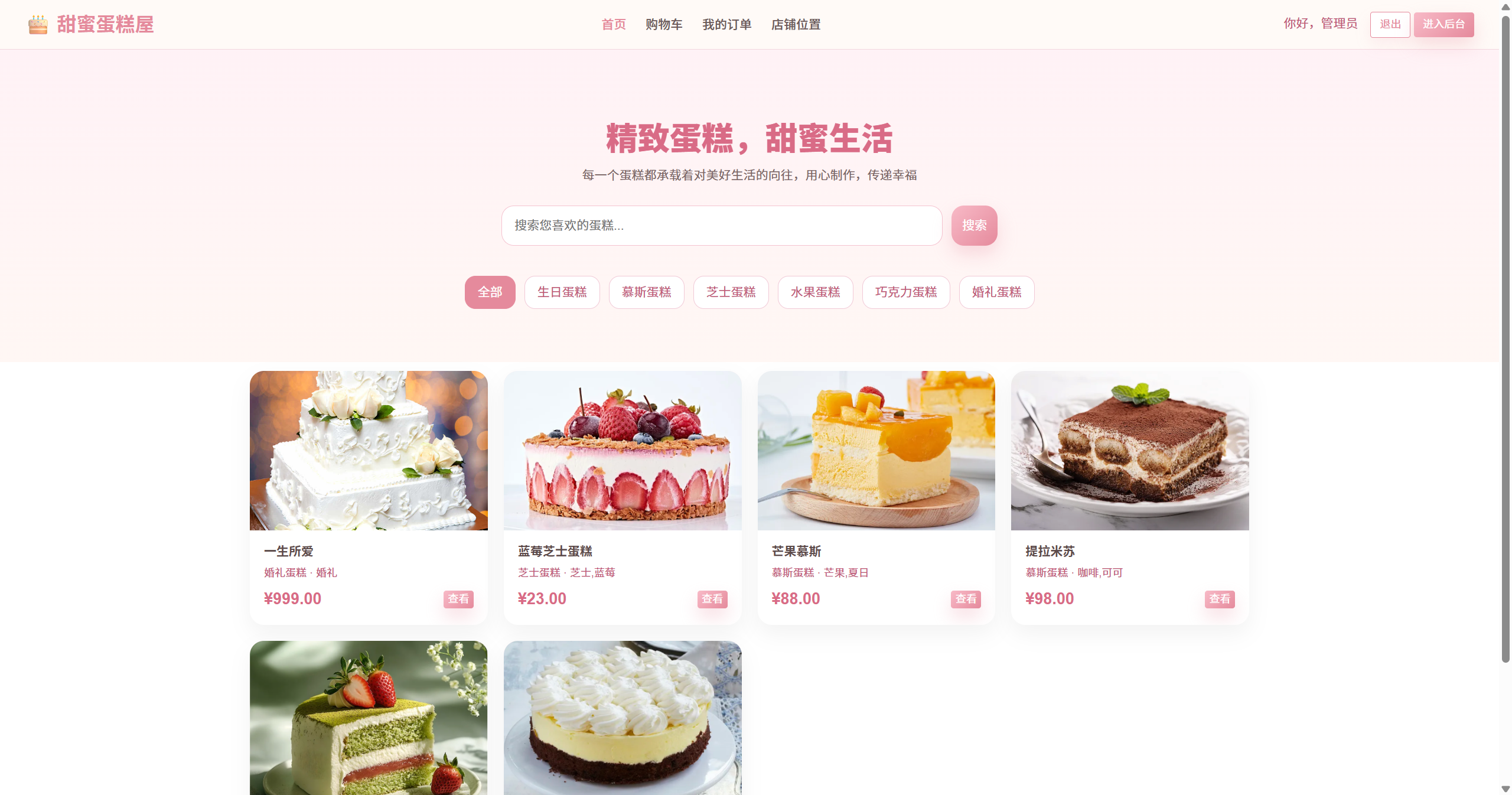 - 前台首页使用大图 Banner + 卡片网格展示蛋糕商品。
