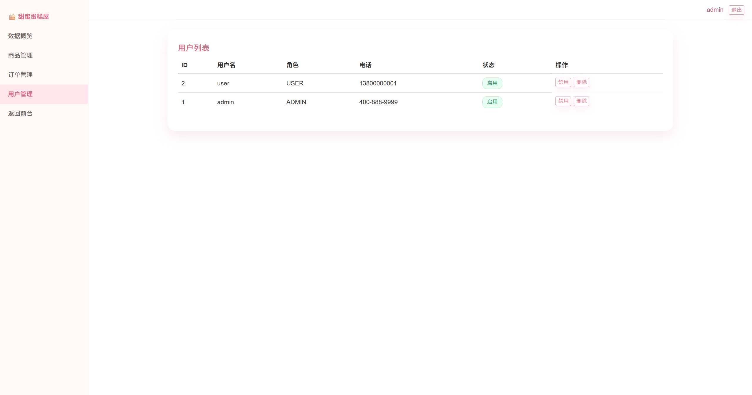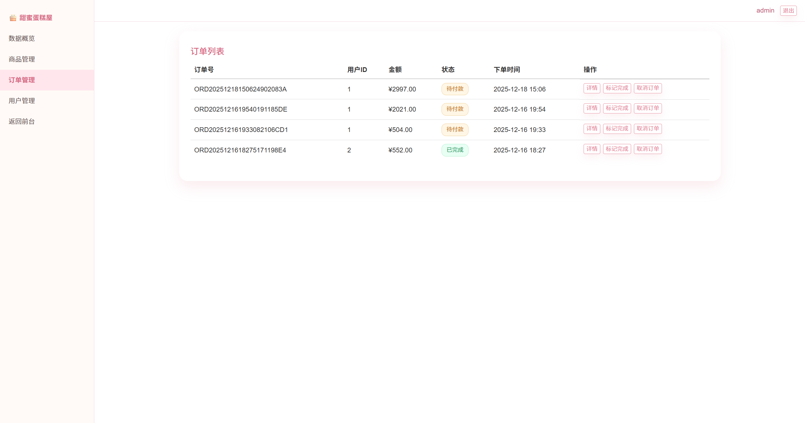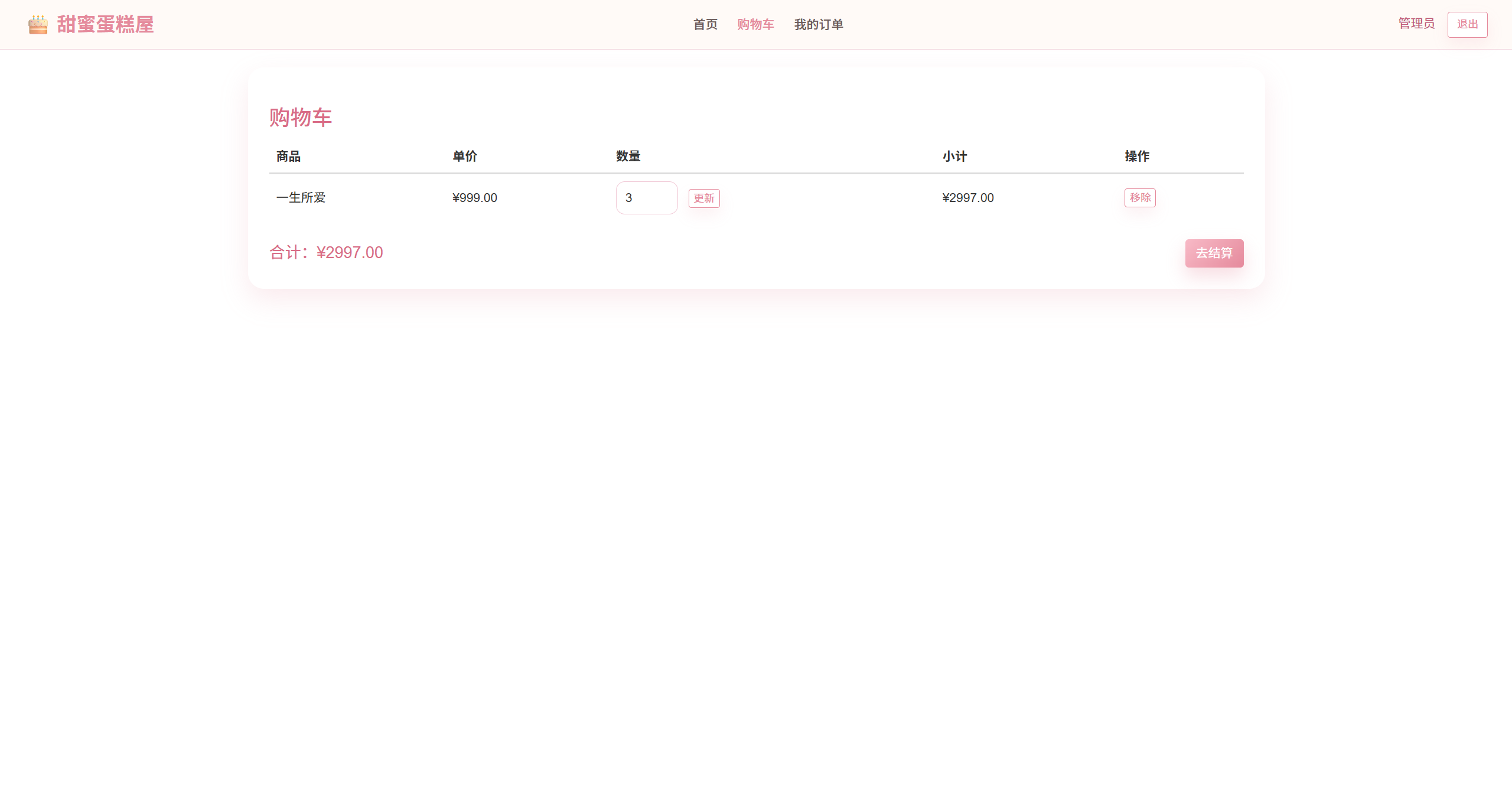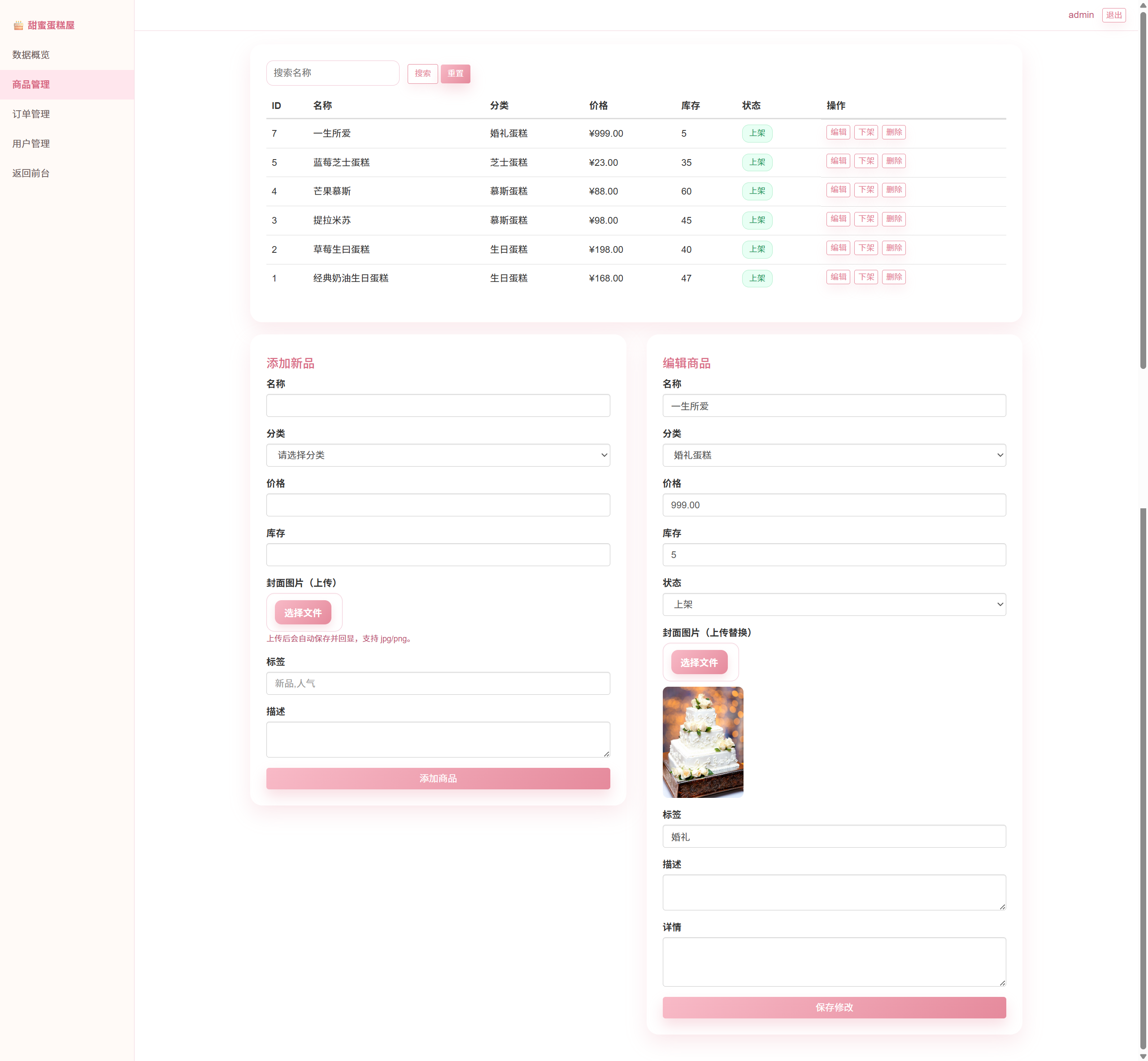 - 前台首页使用大图 Banner + 卡片网格展示蛋糕商品。