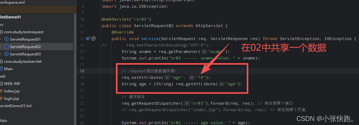 (2)因为请求是转发是一种服务器的行为,当客户端请求到达后,服务器进行转发,所以定义两个Servlet,从第一个Servlet请求转发到第二个Servlet
