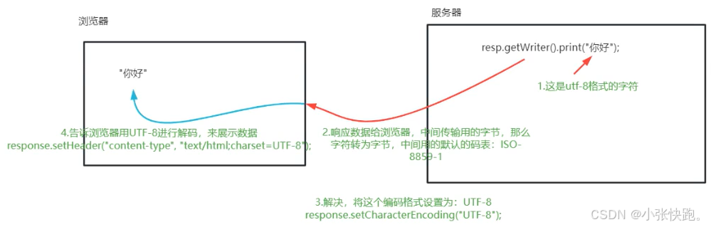 在响应中,如果我们响应的内容中含有中文,则有可能出现乱码。这是因为服务器响应的数据也会结果网络传输,服务器端有一种编码方式,在客户端也存在一种编码方式,当两端使用的编码方式不同时则出现乱码。