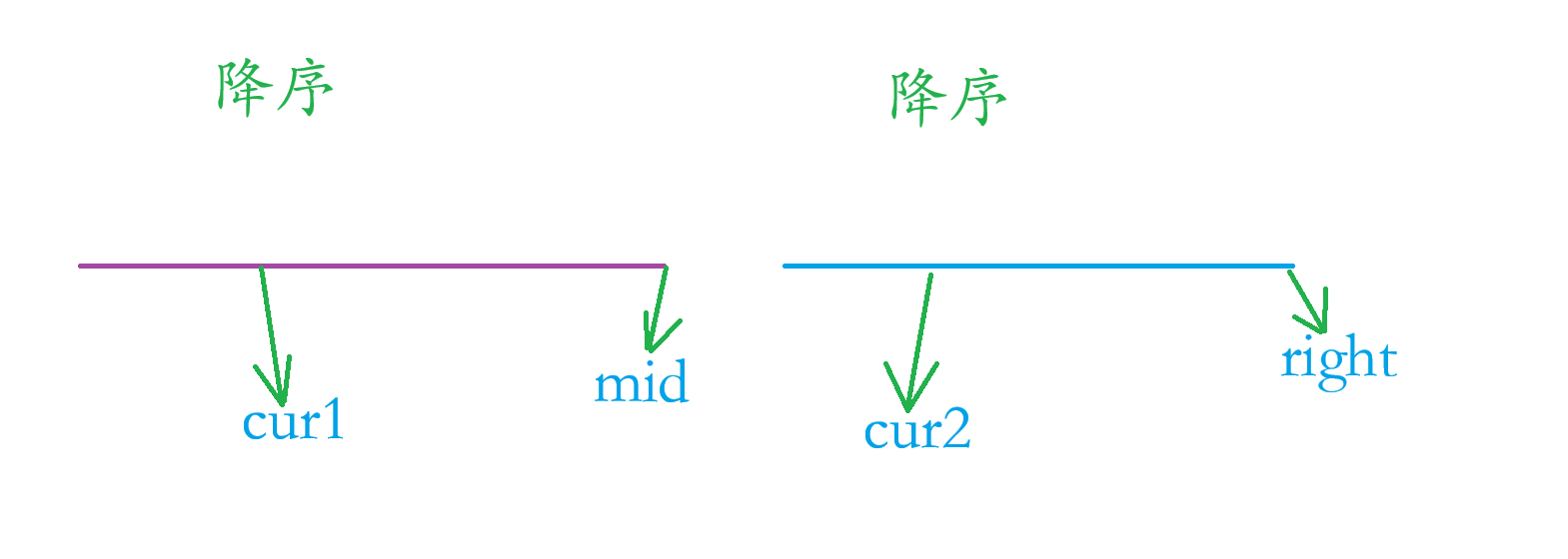 如果:nums[ cur1 ] > 2 * nums[ cur2 ] ,符合题目要求,因为 nums[ cur1 ] > 2 * nums[ cur2 ] 又因为数组都是降序的,所以 【 cur2,right 】 这个区间的数字都符合题目要求。统计完符合题目要求的数字之后,那么 cur1++ 看看后面数字是否有数字大于2倍的nums[ cur2 ] ,那我们的 cur2 还要从头开始判断 nums [ cur1 ] <= 2 * nums[ cur2 ] 吗?答案是:不用,因为 cur1 没有 ++ 之前就已经没有符合题目要求了:nums[ cur1 ] <= 2 * nums[ cur2 ](cur2:【mid + 1,cur2 - 1】),因为数组是降序的,cur1++ 之后更加不会符合题目要了;所以 cur2 不用返回数组的开头重新判断一遍,这样会增加时间复杂度的。