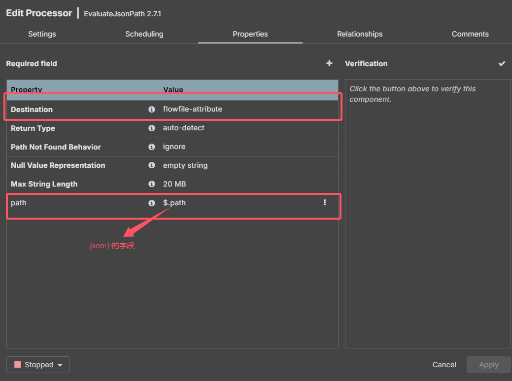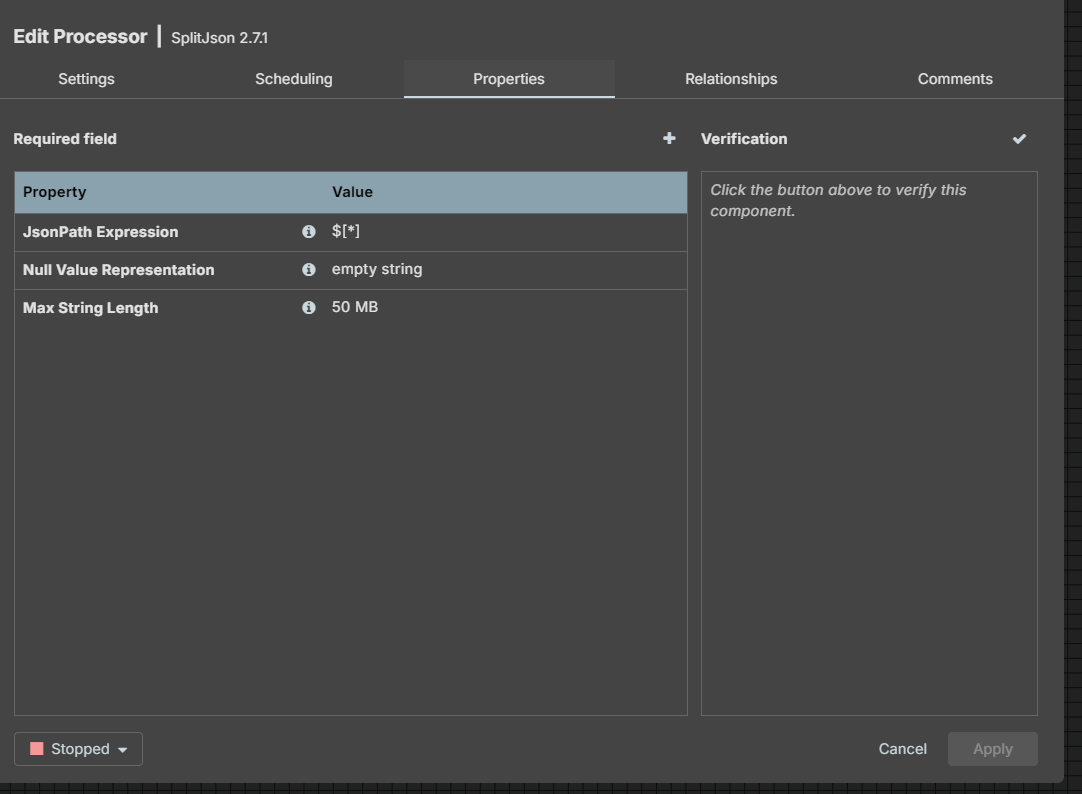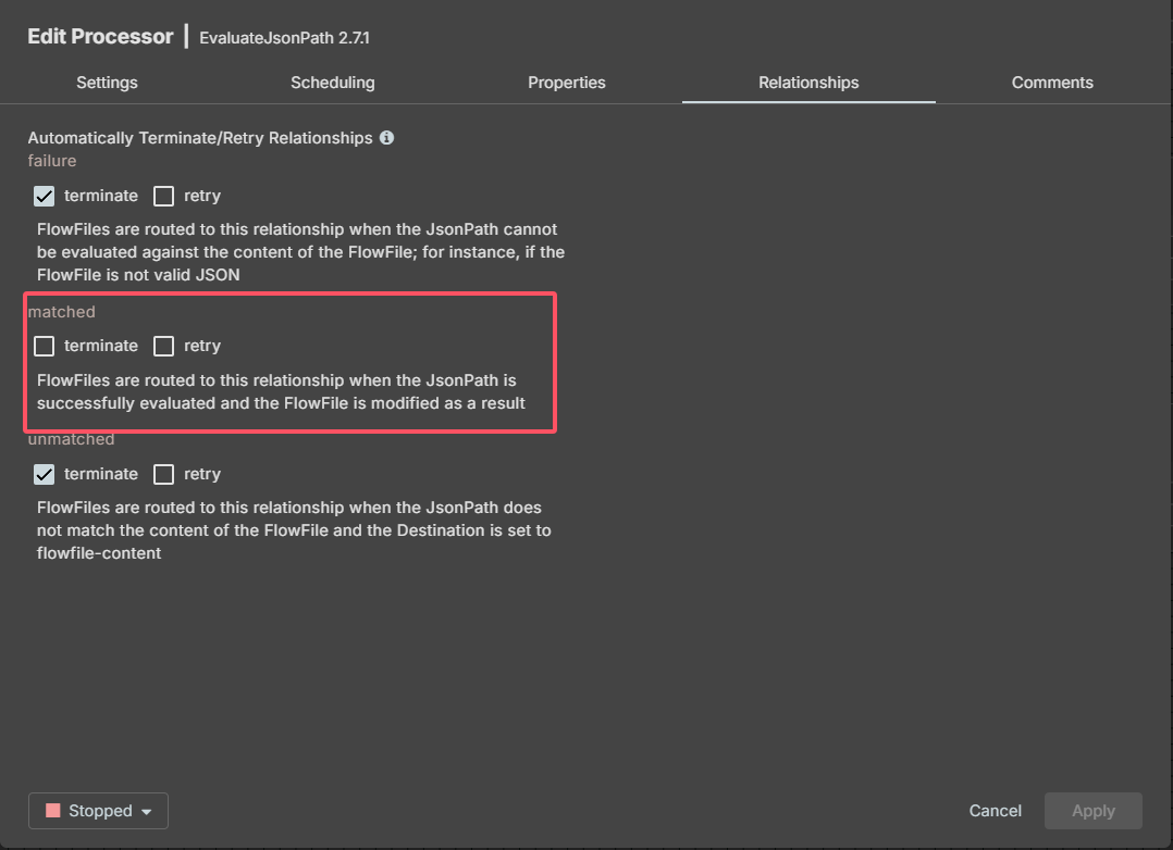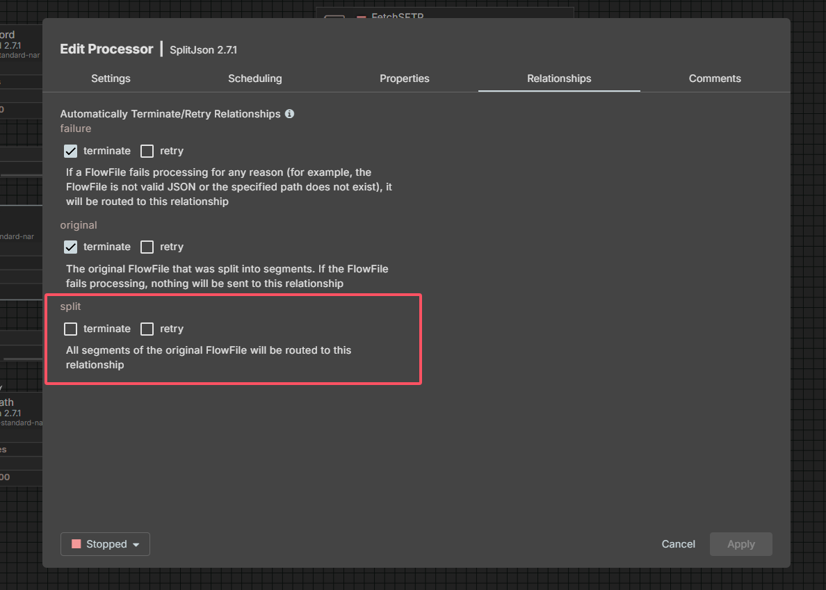 注意:在选择relationships时,不要勾选split,因为下一步的连接关系要使用split,如果这里勾选了split就会失败。因为返回的是JSON数组,所以JsonPath Expression使用$[*]