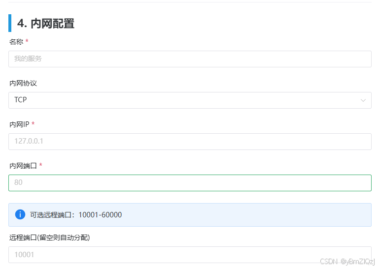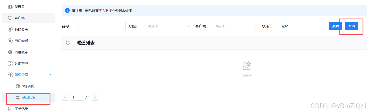 在 控制台 创建一个端口转发隧道,选择节点套餐,选择客户端,配置内网IP、内网端口、备注名称,保存完成。