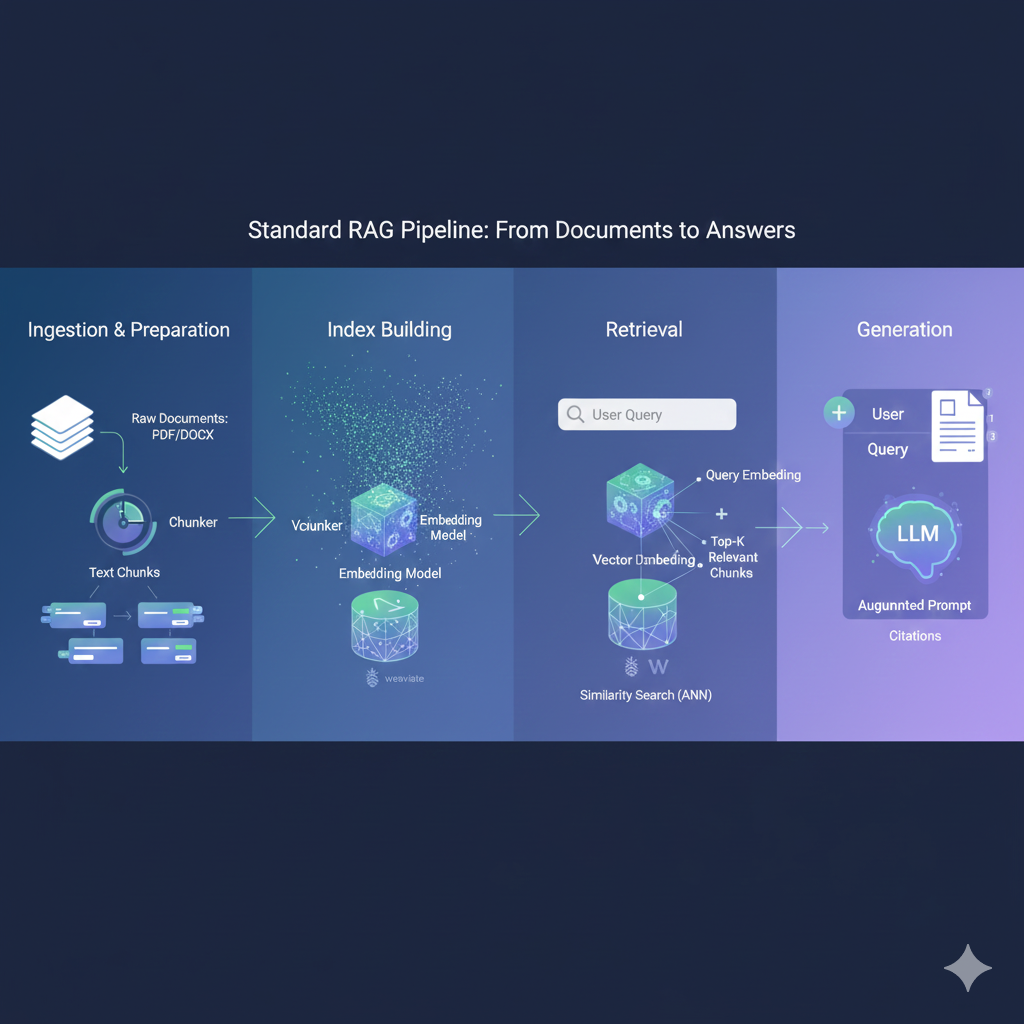 一个标准的 RAG 系统涉及四个主要阶段:内容摄取(数据准备)、索引构建、检索和生成。
