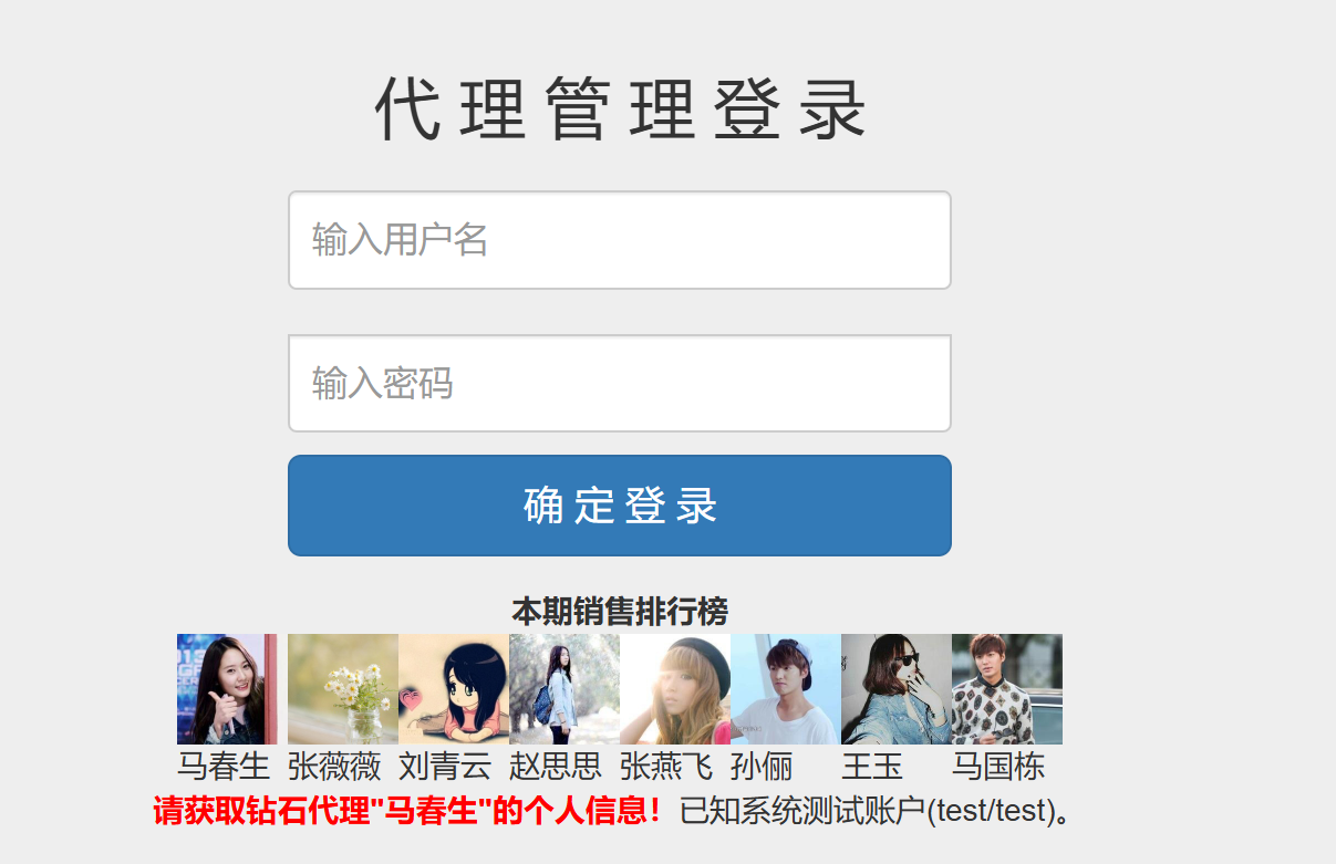 1.这道题 **请获取钻石代理"马春生"的个人信息!**已知系统测试账户(test/test)。