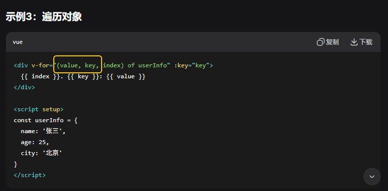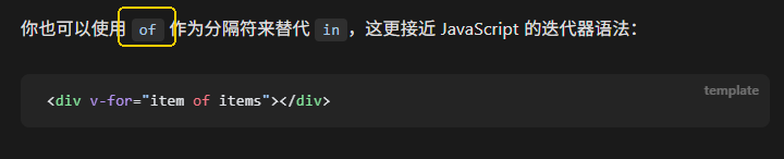 - key 绑定的值期望是一个基础类型的值,例如字符串或 number 类型。不要用对象作为 v-for 的 key。