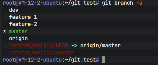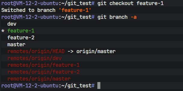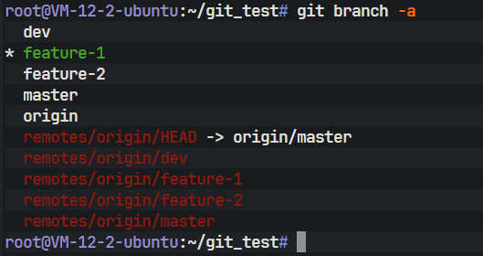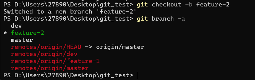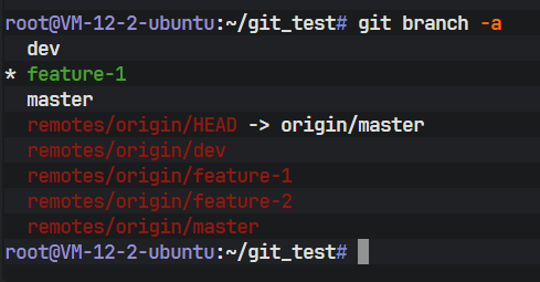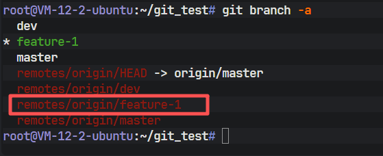 通过 git branch -a 可以看到,remotes/origin/feature-2 已经出现在列表中。