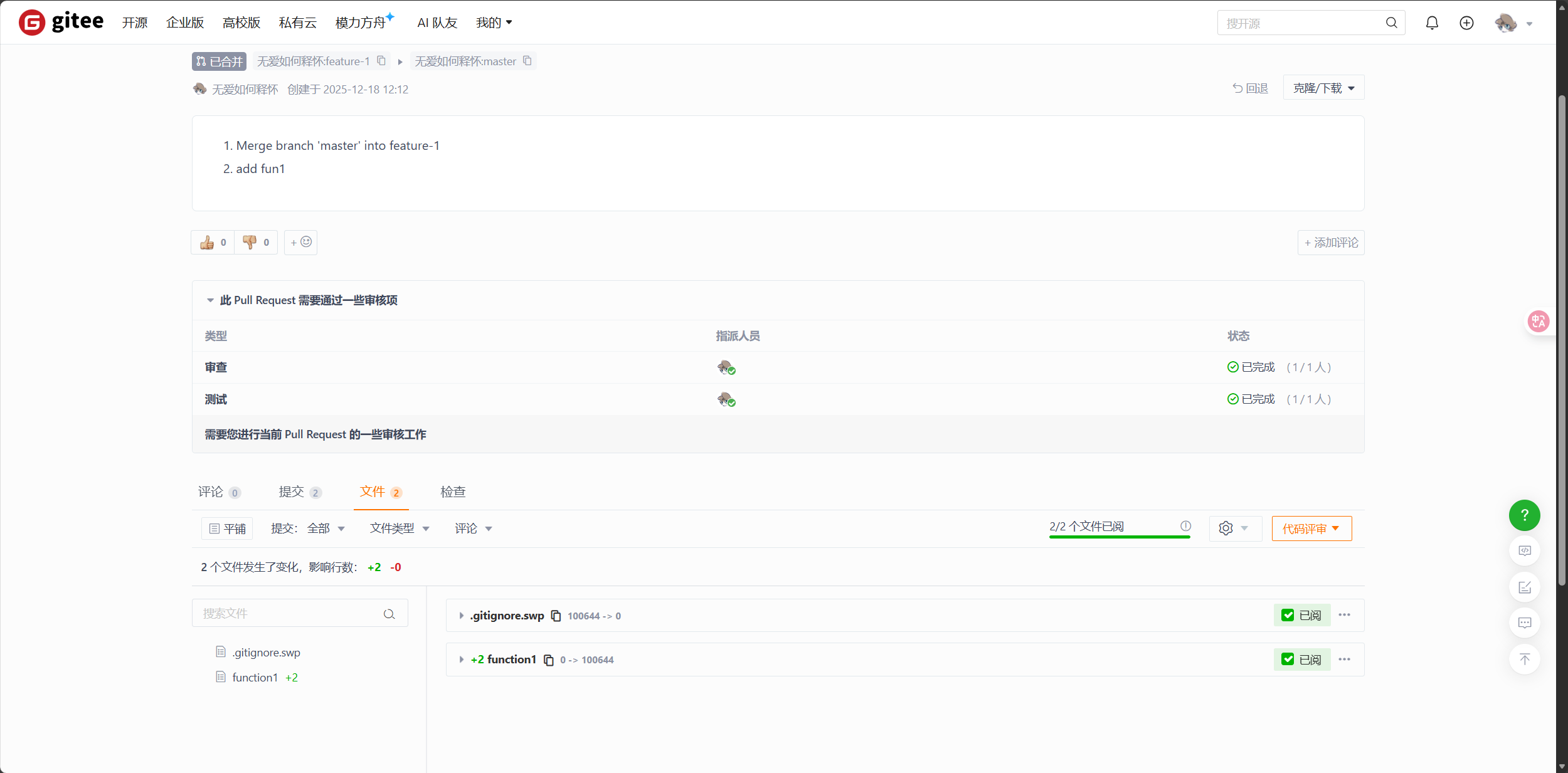 Gitee 会执行合并操作,并在 master 分支上创建一个合并提交。