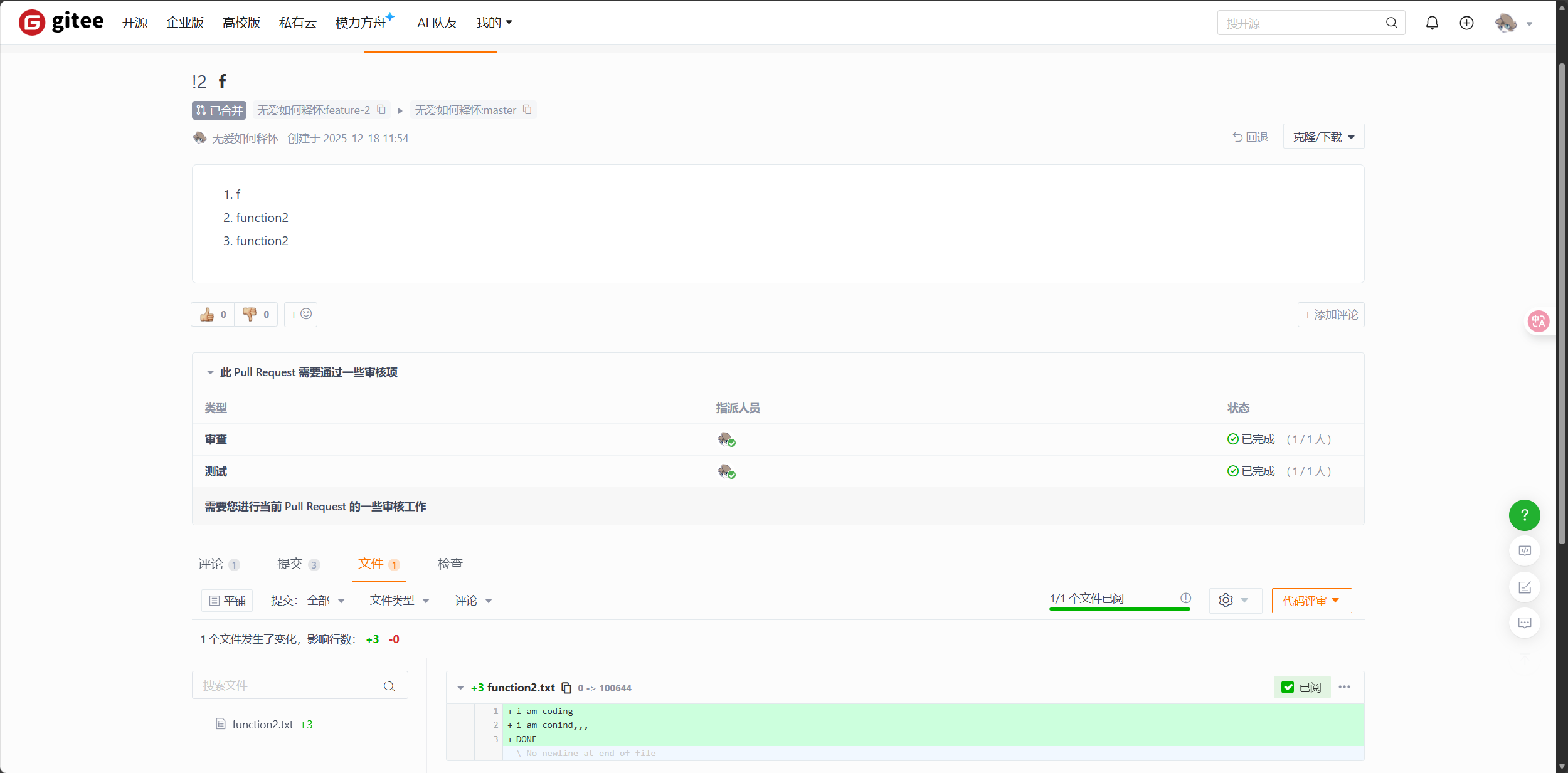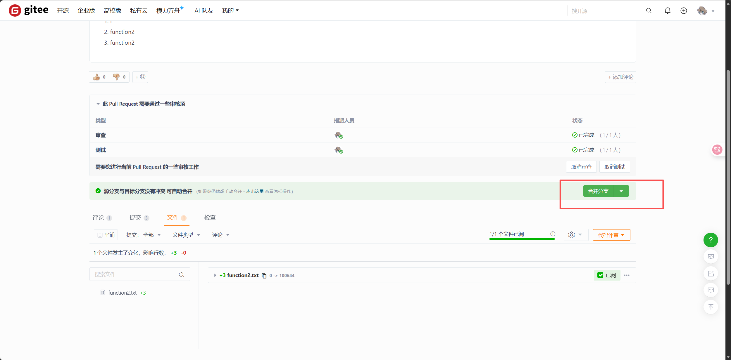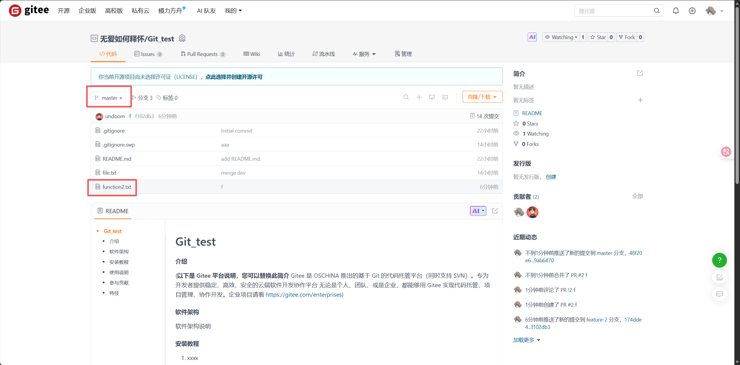 在 Gitee 网页上也可以看到这个新分支以及 function1.txt 文件。