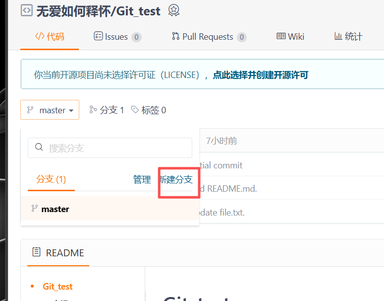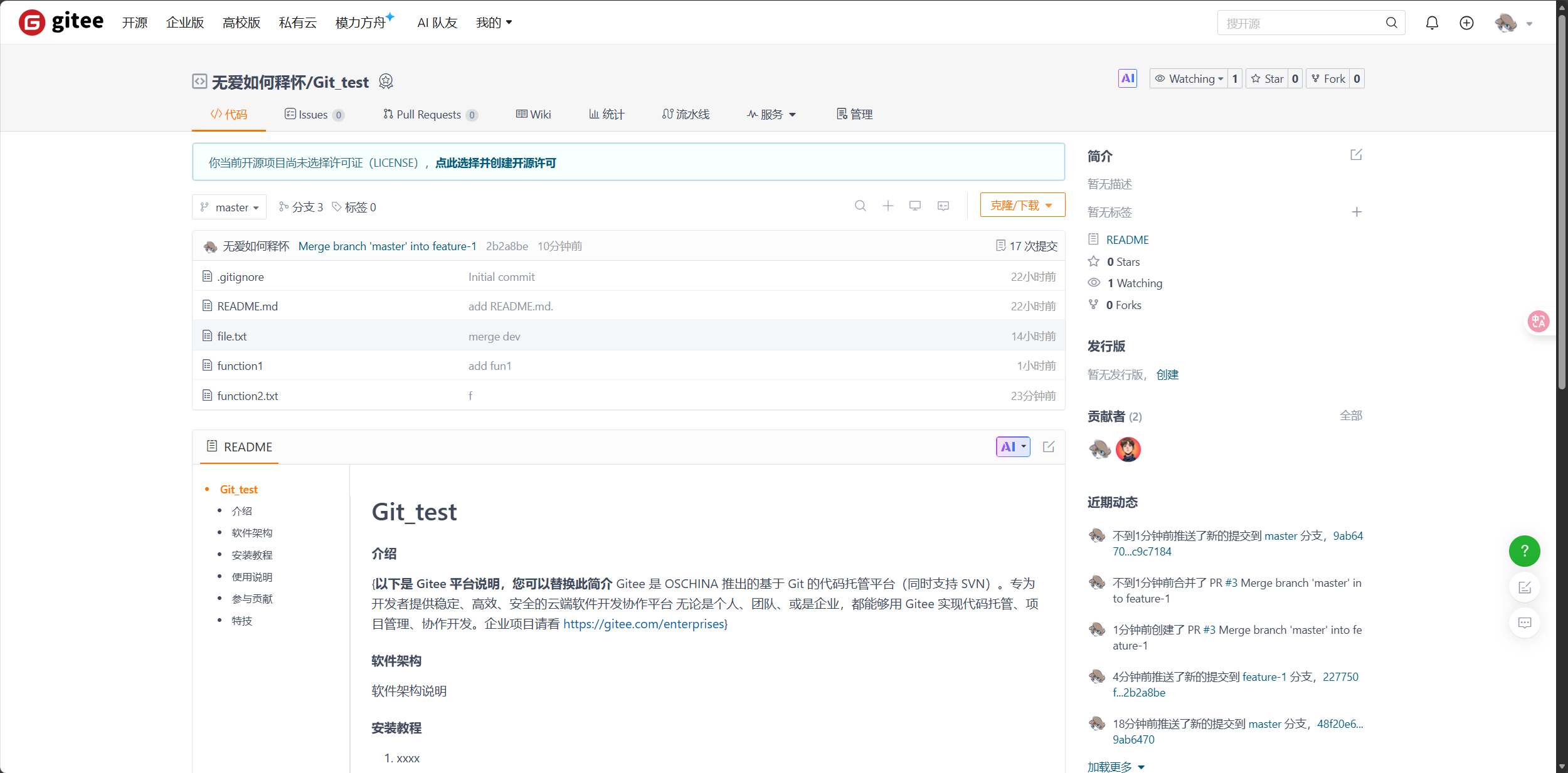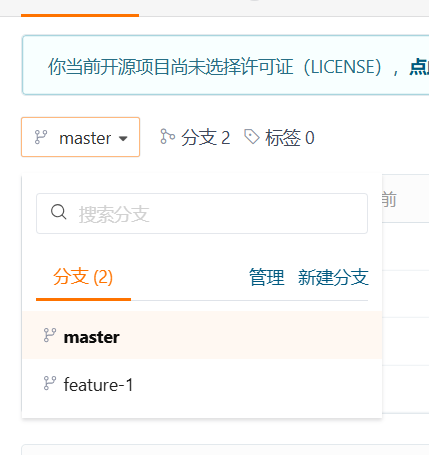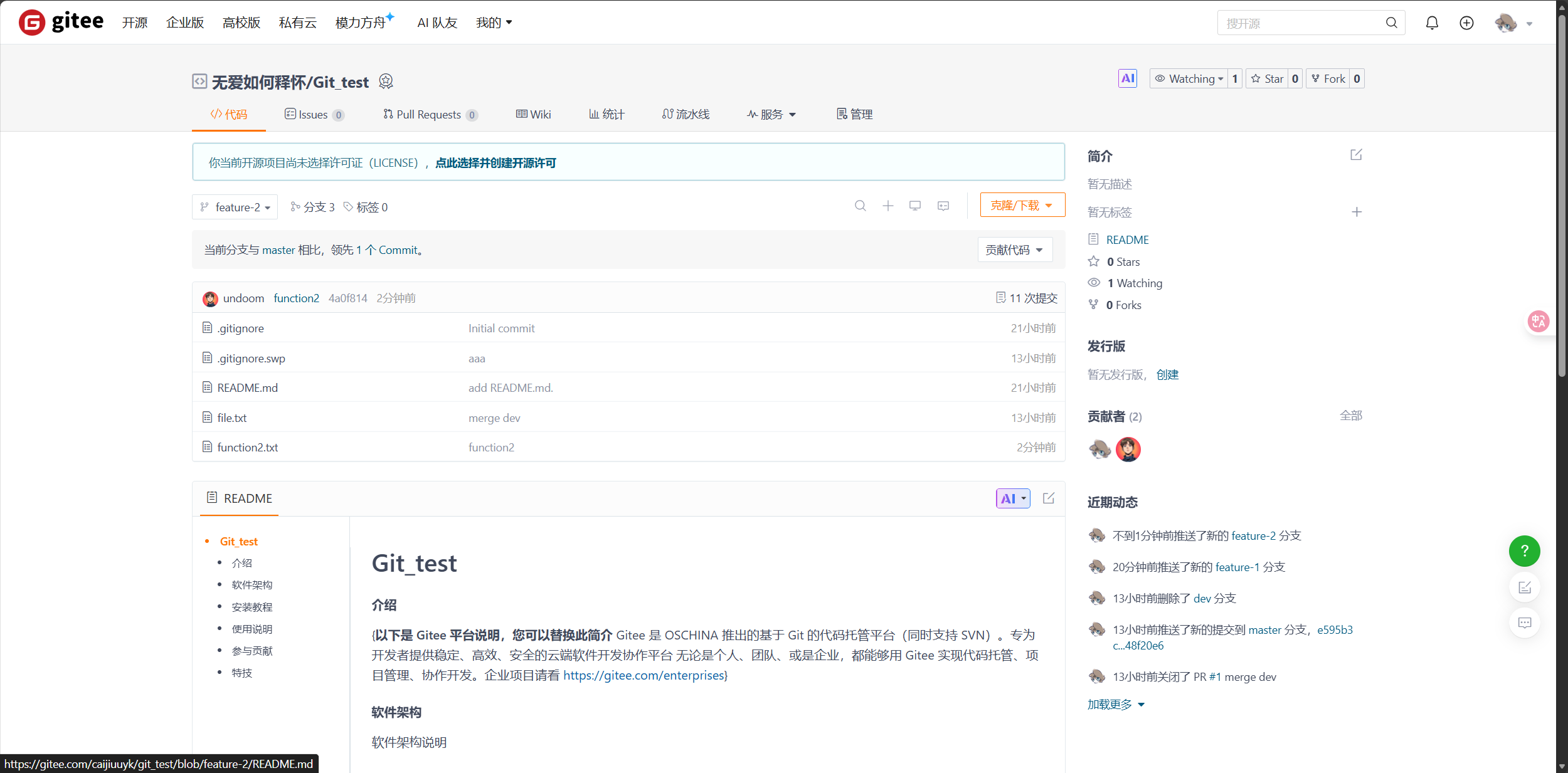 在 Gitee 网页上也可以看到这个新分支以及 function1.txt 文件。