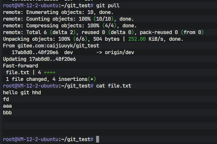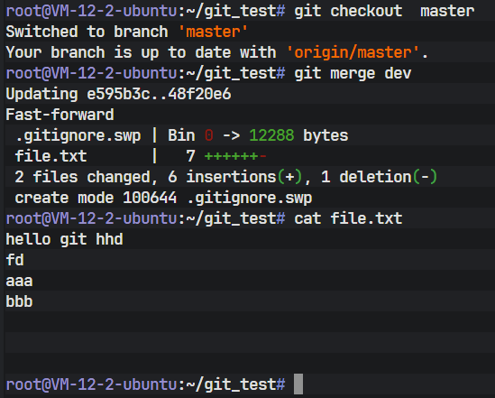 最终,在 master 分支上查看 fille.txt 文件,可以看到 "aaa" 和 "bbb" 都已存在,任务圆满完成。