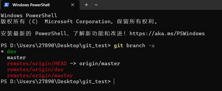 现在,我们再次检查所有分支,以确认 dev 分支已被本地 Git 识别。