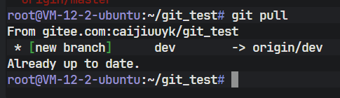 上图的输出信息非常关键。From gitee.com:caijiuuyk/mypicture 表明了数据来源。* [new branch] dev -> origin/dev 是最重要的信息,它明确指出 Git 发现了一个新的远程分支 dev,并已在本地创建了一个对应的远程跟踪分支 origin/dev。Already up to date. 则表示本地的 master 分支与远程的 master 分支内容一致,无需合并。
