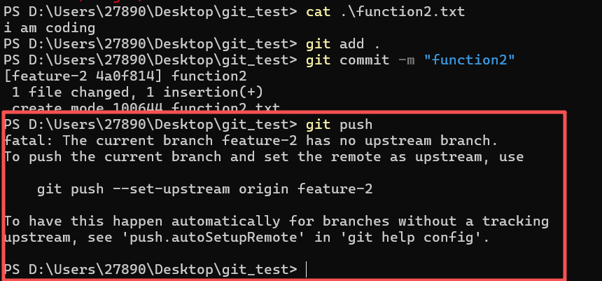 由于开发者2当初创建 feature-2 时也没有建立跟踪关系,所以他也收到了同样的"no upstream branch"错误。