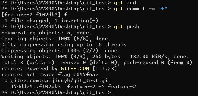 推送成功后,远程仓库现在同时存在 feature-1 和 feature-2 两个功能分支,它们各自独立开发,互不影响。