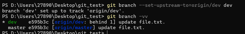 命令执行成功,再次用 git branch -vv 检查,可以看到 [origin/dev] 已经出现,跟踪关系建立成功。