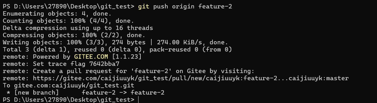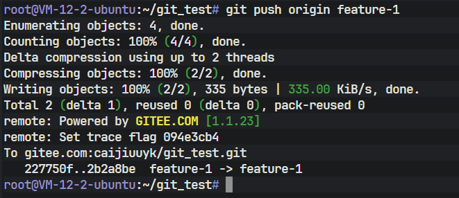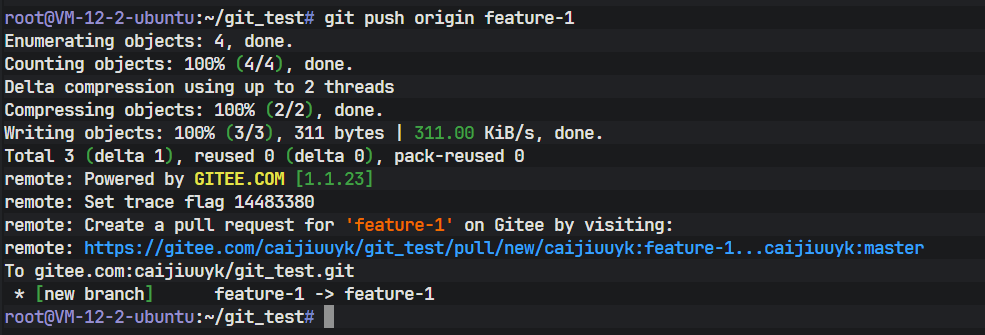 这个命令的含义是:将本地的 feature-1 分支推送到名为 origin 的远程仓库,并在远程也创建一个名为 feature-1 的分支。输出中的 [new branch] 表明远程成功创建了新分支。