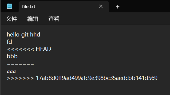 此时,打开 fille.txt 文件,会看到 Git 插入的冲突标记。