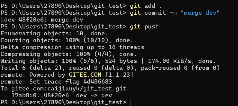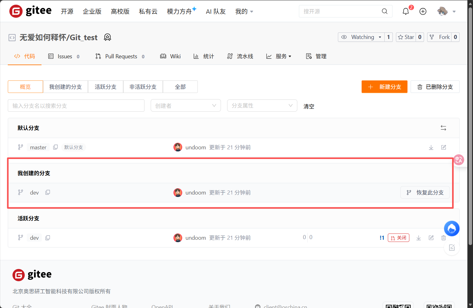 功能开发和合并都已完成,dev 分支的历史使命也就结束了。为了保持仓库的整洁,应该删除这个不再需要的分支。可以在 Gitee 网页上删除远程分支。