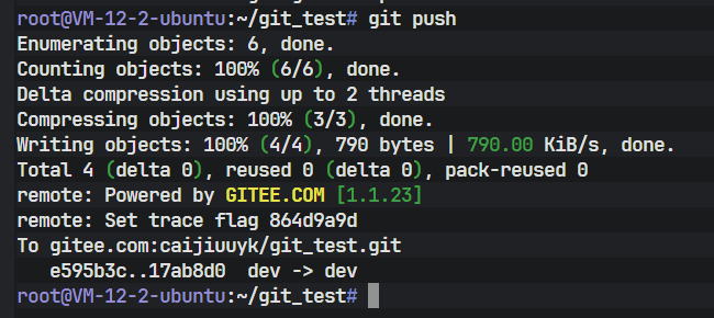 由于之前已经建立了跟踪关系,所以可以直接使用 git push。Git 成功地将本地 dev 分支的提交推送到了 origin/dev。
