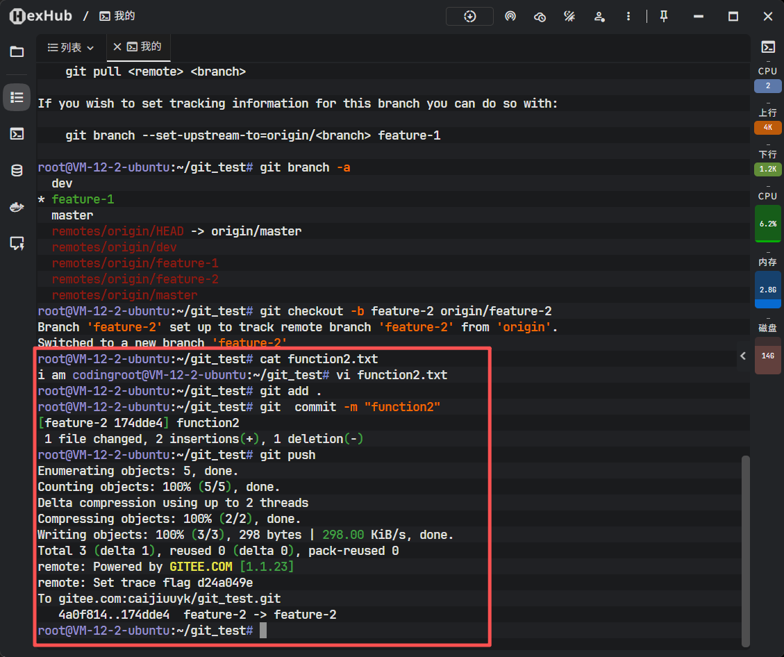 最后,开发者2将最终版本提交并推送到远程 feature-2 分支。