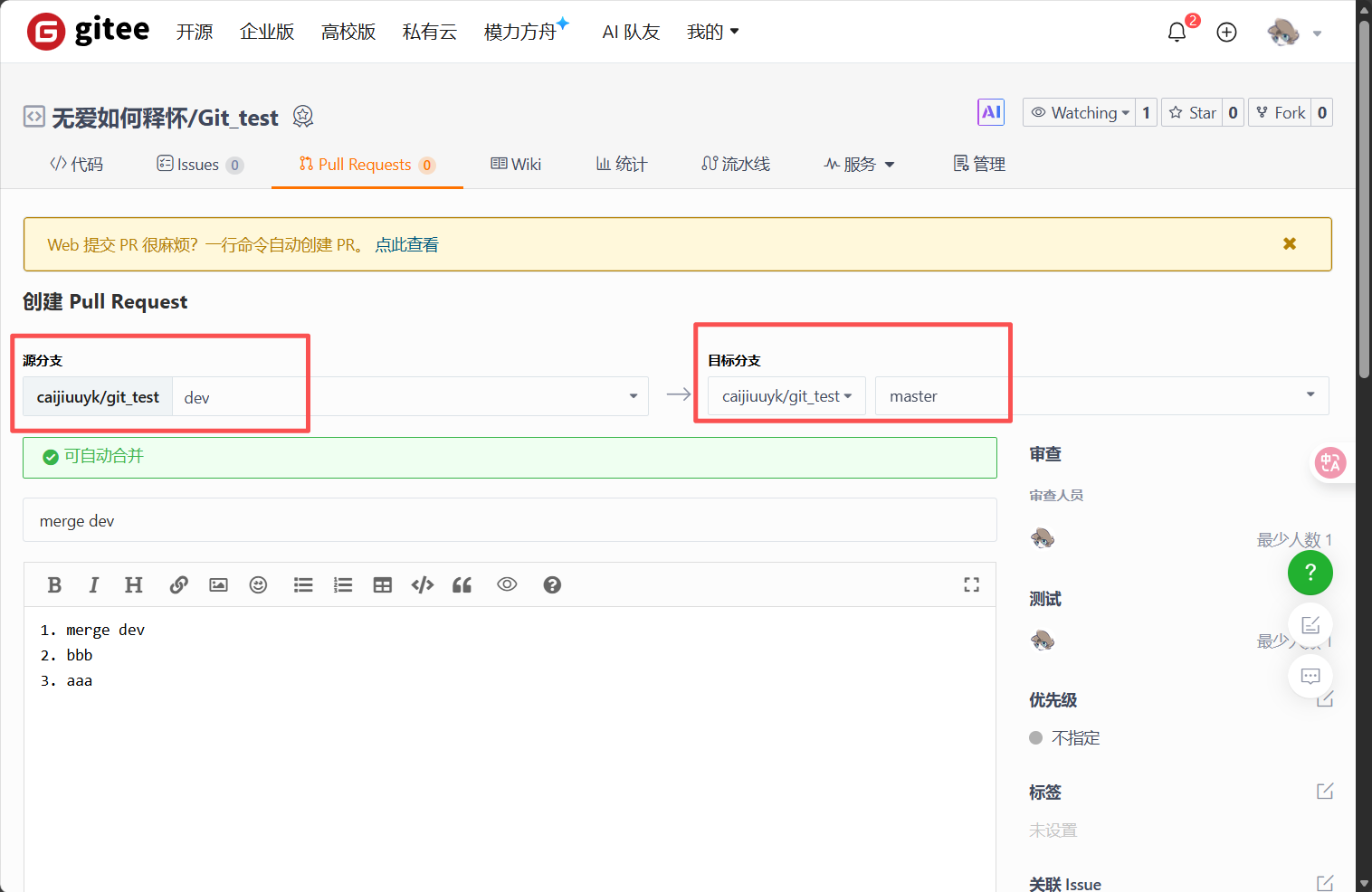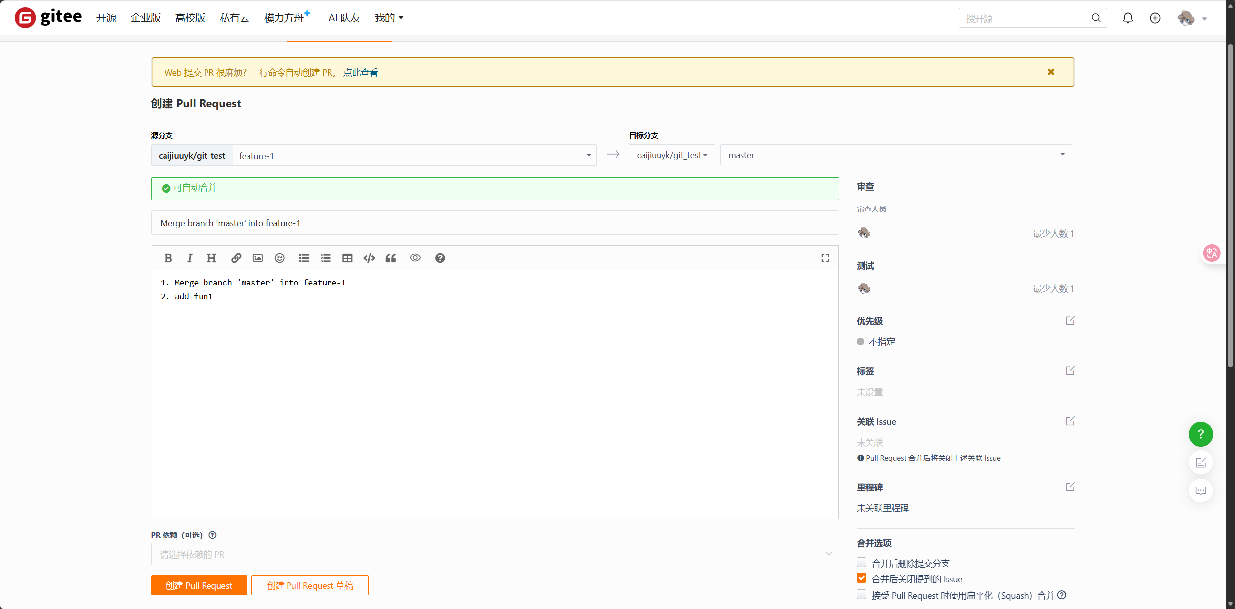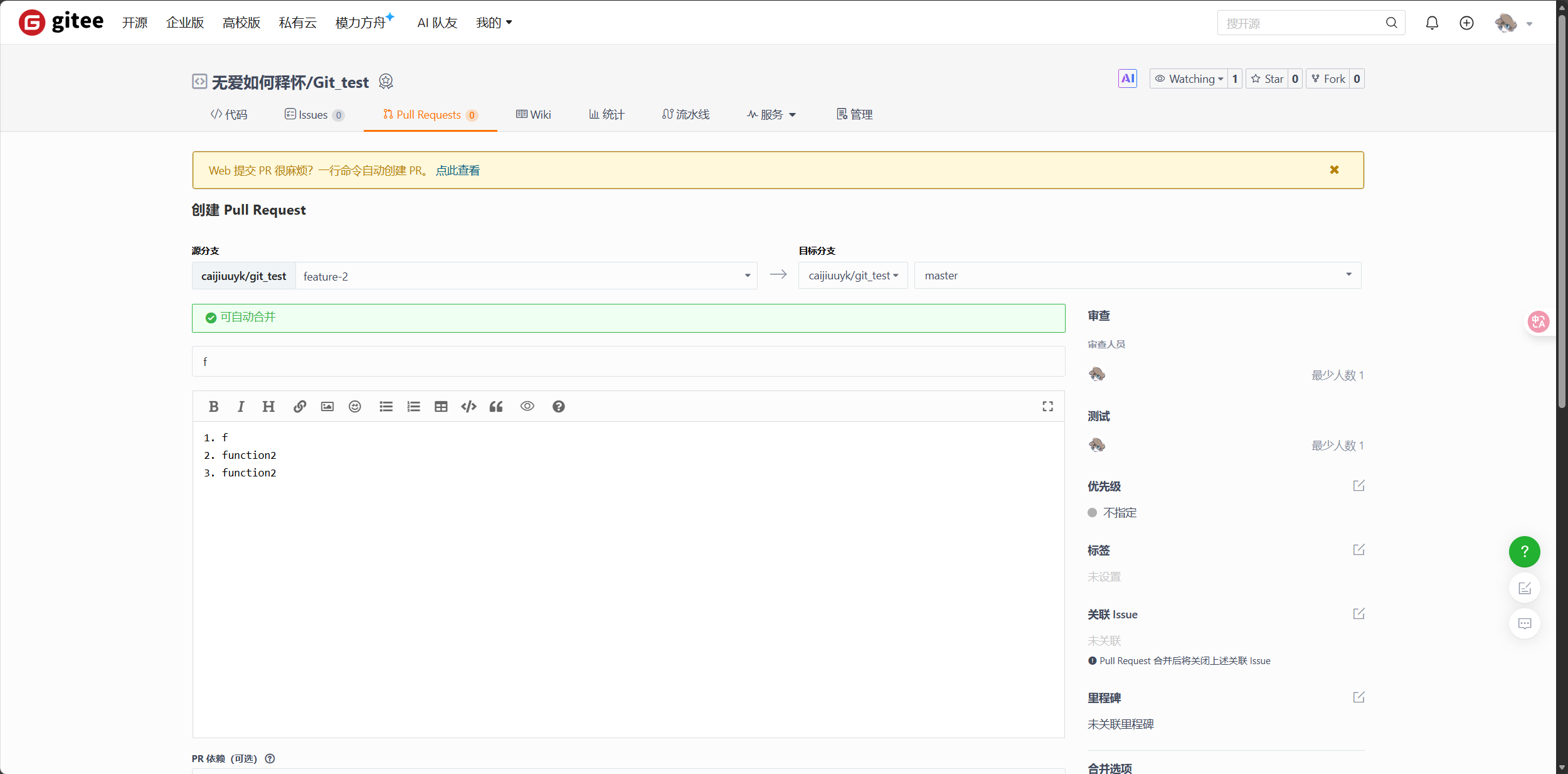 发起 Pull Request (PR) 或 Merge Request (MR) :这是团队协作中最推荐的方式。开发者在 Gitee/GitHub 等平台上创建一个 PR,请求将