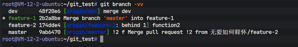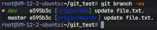 -vv 参数提供了更详细的分支信息。输出中的 [origin/dev] 部分明确地告诉我们,本地的 dev 分支正在跟踪 origin/dev。这意味着当在此分支上执行 git push 或 git pull 时,Git 会自动知道目标是 origin/dev。