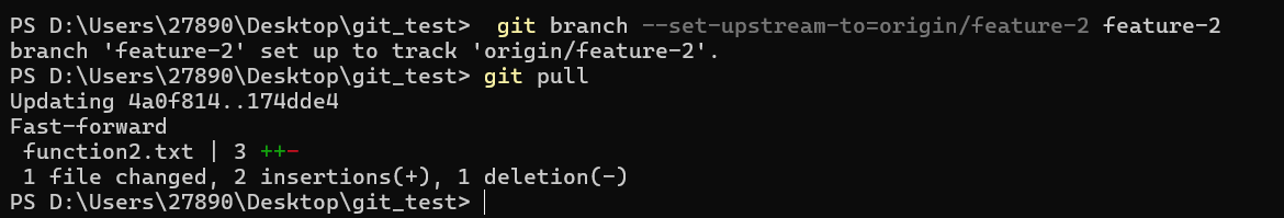 这个命令我们之前见过,它会创建一个本地的 feature-2 分支,并自动设置为跟踪 origin/feature-2。