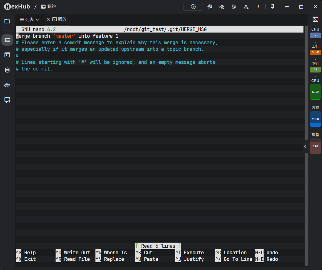 由于 feature-1 和更新后的 master(包含了 function2.txt)修改的是不同的文件,所以没有冲突。Git 自动创建了一个合并提交。执行 git merge 后,通常会弹出一个文本编辑器,让用户编辑合并提交的信息,保存并退出即可。
