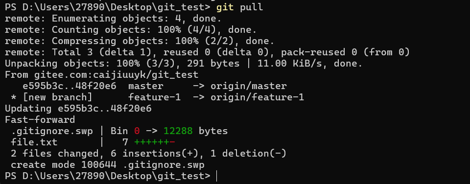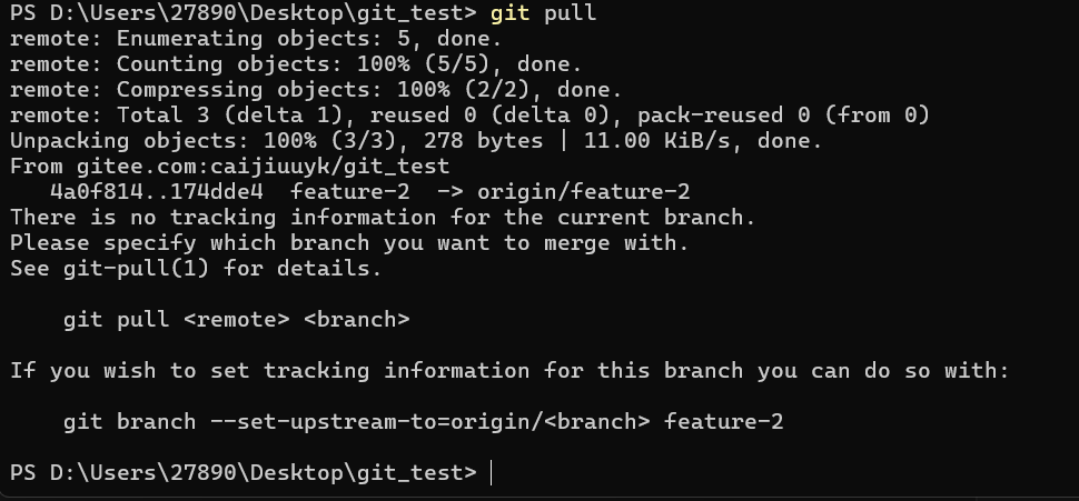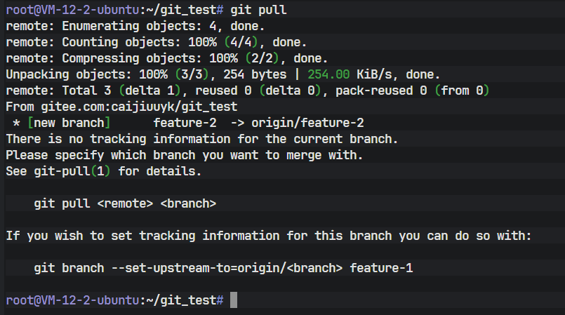开发者1当前在 feature-1 分支上,他执行 git pull 时,Git 提示 feature-1 没有设置上游分支(因为他之前创建时没有用 -u 参数)。尽管有这个提示,但 git pull 的 fetch 部分仍然成功执行了,它从远程抓取了所有分支的最新信息,包括 feature-2 的存在。