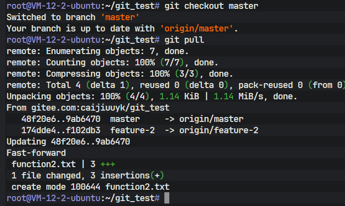 现在,本地的 feature-1 分支既包含了它自己的功能(function1.txt),也包含了来自 master 的最新更新(function2.txt)。将这个更新后的 feature-1 推送到远程。