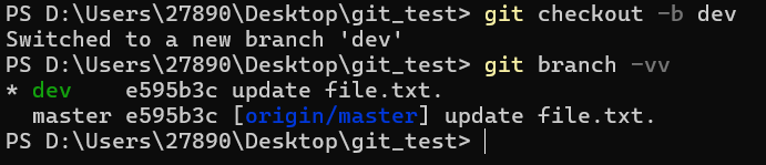 git checkout -b dev 仅仅是基于当前分支(这里是 master)创建了一个新的本地分支 dev 并切换过去。从 git branch -vv 的输出中可以看到,这个新建的 dev 分支后面没有 [origin/dev] 标记,说明它没有与任何远程分支建立跟踪关系。