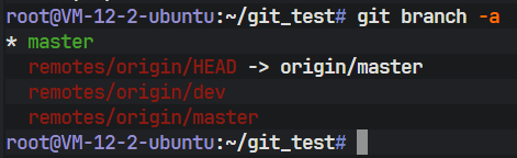 使用 -a(--all)参数,可以列出所有本地分支和远程跟踪分支。从图中可以看到,除了本地的 master 和远程的 origin/master,现在列表中明确出现了红色的 remotes/origin/dev。这标志着开发者1的本地环境已经成功与远程仓库同步,可以开始在 dev 分支上进行工作了。
