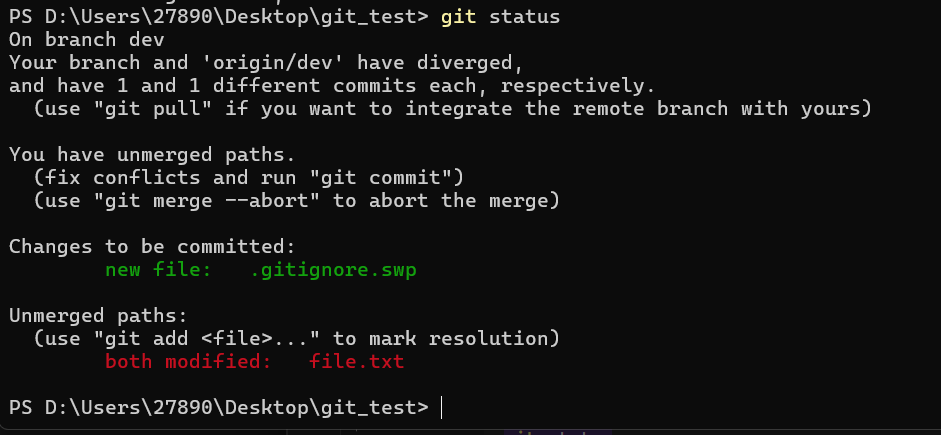 修改文件并保存后,需要告知 Git 冲突已经解决。首先,查看当前仓库的状态。