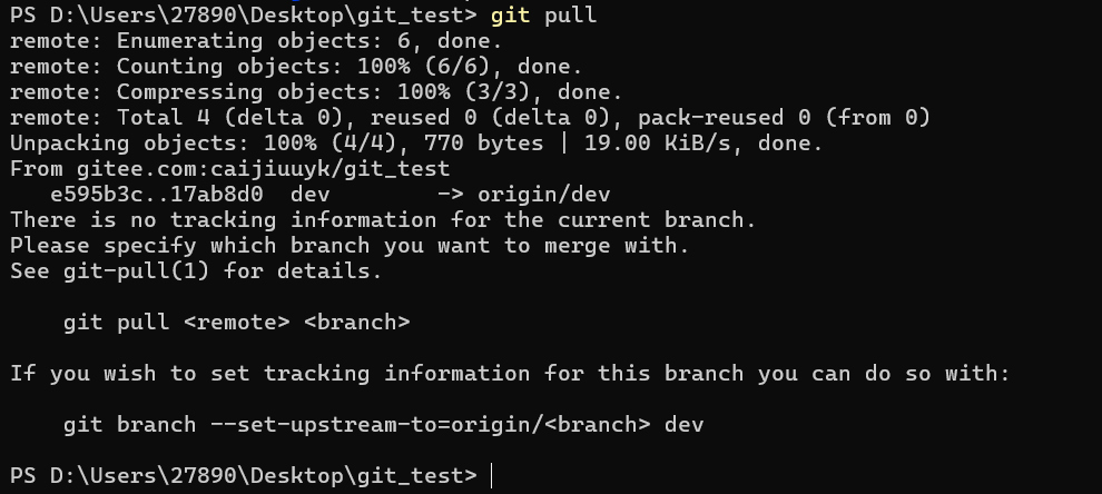 Git 提示了一个非常常见的错误信息:"There is no tracking information for the current branch." (当前分支没有跟踪信息)。这是因为 Git 不知道本地的 dev 分支应该从远程的哪个分支拉取数据。Git 在提示中还给出了解决方案:执行 git branch --set-upstream-to=origin/<branch> dev 来建立连接。