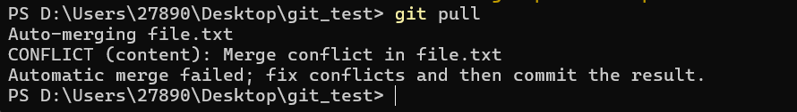 git pull 尝试自动合并远程的 origin/dev 分支。但是,由于开发者1和开发者2都修改了 fille.txt 文件的同一区域,Git 无法自动决定最终应该保留哪个版本,于是报告了一个合并冲突(Merge conflict)。终端输出 CONFLICT (content): Merge conflict in fille.txt 和 Automatic merge failed; fix conflicts and then commit the result.,清晰地指明了冲突文件和下一步操作。