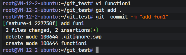 开发者1在 feature-1 分支上创建 function1.txt 文件,写入内容,然后进行 add 和 commit。
