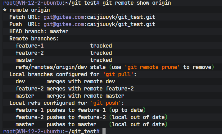 在输出中,Stale tracking branches 部分明确列出了 dev, feature-1, feature-2 是过时的。
