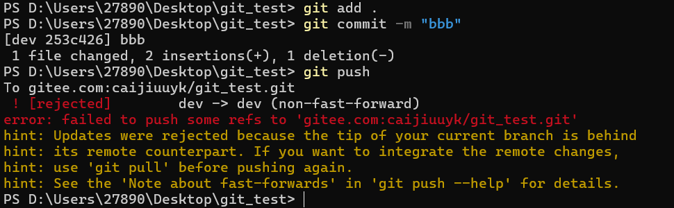 推送被远程服务器拒绝(rejected)。这是多人协作中极其常见的场景。错误提示 updates were rejected because the remote contains work that you do not have locally 明确地指出了原因:远程 dev 分支包含了本地所没有的提交(即开发者1添加 "aaa" 的提交)。Git 为了防止意外覆盖他人的工作,强制要求开发者必须先将远程的变更合并到本地,解决所有差异后,才能推送。