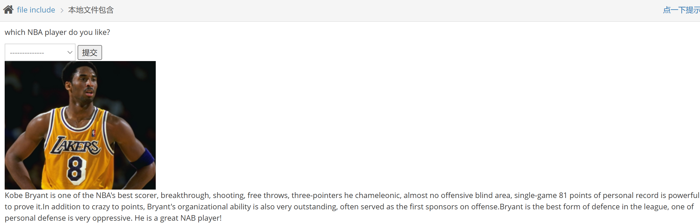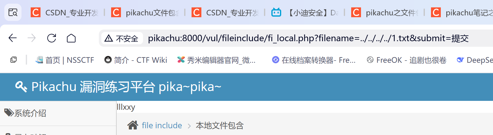 此时的url:http://pikachu:8000/vul/fileinclude/fi_local.php?filename=file1.php&submit=%E6%8F%90%E4%BA%A4