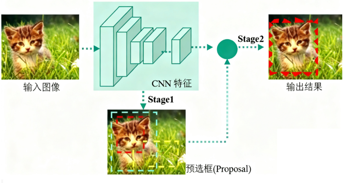 Two-Stage 先进行区域生成,该区域称之为region proposal(简称RP,一个有可能包含待检物体的预选框),再通过卷积神经网络进行样本分类。 任务流程:特征提取 -- 生成RP -- 分类/定位回归。 代表:R-CNN系列算法