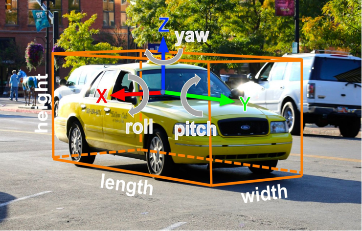 - (x,y,z,w,h,l,r,p,y) 简化版边界框: 无翻滚角与俯仰角 比 2D 目标检测困难得多