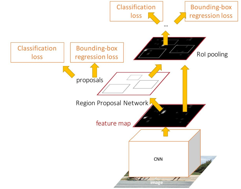 网络结构:共享卷积层 → ROI Pooling → 全连接层 → 两个并行分支