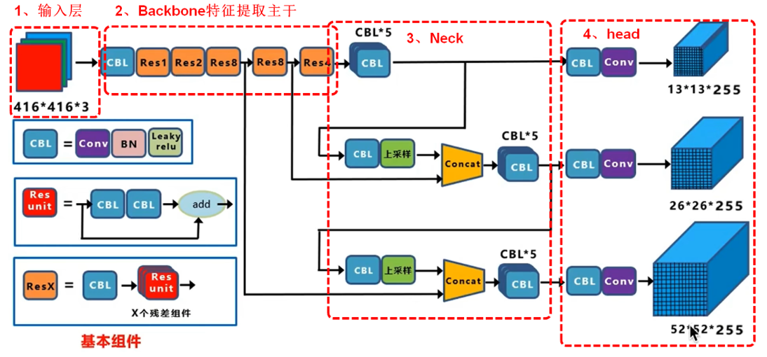 - 使用 Darknet-53 作为骨干网络,有 53 层卷积层,采用残差结构