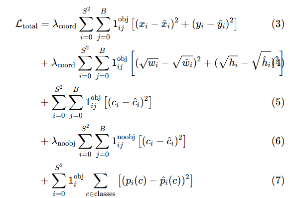 YOLO v1 的损失函数设计复杂,目的是平衡分类、定位和置信度的误差,总损失公式为: